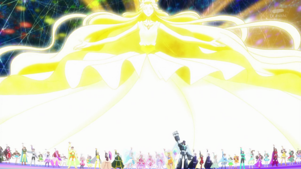 If our heroines can become Cures, then why not everyone, that actually happens during the final battle with George Kurai in Hugtto Precure. The Hugtto Precure team gave everything they had to save their town as well as the future from becoming frozen and with despair. Luckily all the supporting characters as well as the reformed Crisasu villains cheered them on. As thanks for their courage the Cures shared their power with them to have everyone become Cures themselves. This was a fantastic moment since we were in the 15th anniversary season at the time so why not celebrate it for the final time with everyone getting involved including the final attack. Of course we knew about Henri becoming Cure Infini in a previous episode but seeing everyone in their Cure forms had really good designs. Dr Traum’s robot cure form made me laugh so hard.